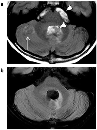 FLAIR images of a 5-year-old male patient with astrocytoma (post-resection). Bright CSF-flow-related enhancement (FRE, arrowheads) in fourth ventricle and prepontine cisterns is seen in SENSE FLAIR (a), not present in CS FLAIR (b). As a consequence, the CSF-dependent ghosting artifacts (arrow) did not occur.