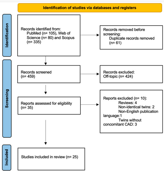 Kamzolas O, Papazoglou AS, Gemousakakis E, Moysidis DV, Kyriakoulis KG, Brilakis ES, Milkas A. Concomitant Coronary Artery Disease in Identical Twins: Case Report and Systematic Literature Review. Journal of Clinical Medicine. 2023; 12(17):5742. https://doi.org/10.3390/jcm12175742