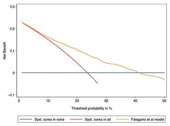 DCA showed an increased net clinical benefit compared to the net benefit of using a strategy of systematic cores in everyone and a strategy of systematic cores in no when the threshold probability was between 10% and 40% (Figure 3).