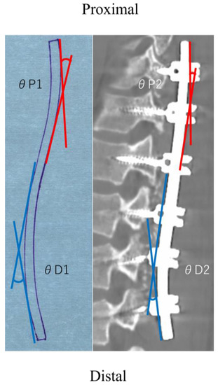 The rod angle was measured using the rod shape on the left side. Prior to applying the contouring rod to the screw head, the contours of the rod shapes were traced on paper [16]. The angle between the proximal and distal tangential lines was measured at the proximal and distal curvature before implantation (θP1 and θD1, respectively) (Figure 1). The postoperative implant rod shape was obtained from the Digital Imaging and Communications in Medicine (DICOM) data from the 1-week postoperative CT scan. DICOM data were used to reconstruct the sagittal rod images using a DICOM viewer software (OsiriX Lite 12.0.1, Pixmeo Labs, Geneva, Switzerland). The postoperative rod angles were evaluated in a similar manner to that of the preoperative measurements from the sagittal reconstructed rod images (θP2 and θD2, respectively) (Figure 1). The difference between θ1 and θ2 (θ1–θ2) was calculated as the rod deformation (Δθ) [20,21,22].