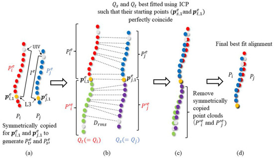 As shown in Figure 2b, when aligning two combined point clouds and in a rod group the point cloud with the shorter evaluation interval length was selected as the source point cloud , and the point cloud with the longer interval length was chosen as target point cloud . Subsequently, the source point cloud was best fitted to the target point cloud using the following ICP method [23].
