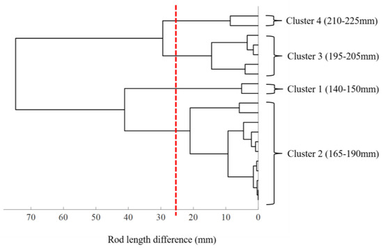 Since the curve lengths of the center point clouds of the 20 rods ranged from 145 to 220 mm, knowing which rods could be aggregated into one group based on length criteria was essential to prepare for the rod pre-cutting process. To this end, the difference in curve lengths between all the rods was evaluated as the distance between the different rods first, and a hierarchical cluster analysis with a complete linkage was conducted for the balanced, length-based grouping of the rods using our MATLAB code. The cluster analysis can identify the rod groups the total number of rod groups) such that the maximum difference in length among the rods in a group is less than the allowable value.