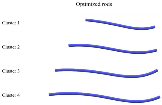 The rods were classified into four clusters according to their length (Figure 3). The number of rods was two in cluster 1 (140–150 mm), eleven in cluster 2 (165–190 mm), five in cluster 3 (195–205 mm), and two in cluster 4 (210–225 mm). The dendrogram obtained using the ICP method is shown in Figure 4. Without dividing the point clouds in the length-based cluster, the Drms, which is the overall difference between each point cloud, was <5 mm in all the clusters (Table 3). The Drms and the Dmax between the best-fitted curvature and the other point clouds of the rods in each cluster are shown in Table 3. The Drms ranged from 0.21 to 1.91 mm, and the Dmax ranged from 0.46 to 4.32 mm. Finally, the best-fitted curvature and STL images for the three-dimensional rods in each cluster are presented in Figure 5.