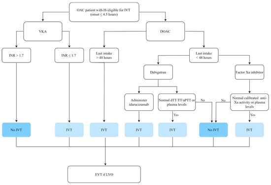 Intravenous thrombolysis (IVT) in patients on oral anticoagulant (OAC) treatment. VKA, vitamin K antagonist; DOAC, direct oral anticoagulants; INR, international normalized ratio; dTT, dilute thrombin time; TT, thrombin time; aPTT, activated partial thromboplastin time; EVT, endovascular treatment.