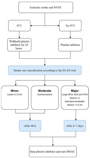 Timing of initiation of oral anticoagulation (OAC) after ischemic stroke (IS) in patients with non-valvular atrial fibrillation (NVAF) according to the ELAN trial results [92]. IVT, intravenous thrombolysis; MCA, middle cerebral artery; ACA, anterior cerebral artery; PCA, posterior cerebral artery; DOAC, direct oral anticoagulants.