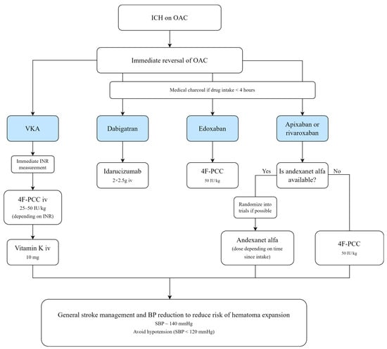 Reversal of oral anticoagulation (OAC) in patients with intracerebral hemorrhage (ICH). VKA, vitamin K antagonist; 4F-PCC, f-factor prothrombin complex concentrate; BP, blood pressure; SBP, systolic blood pressure.