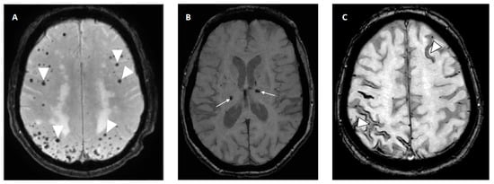- Charidimou, A.; Linn, J.; Vernooij, M.W.; Opherk, C.; Akoudad, S.; Baron, J.-C.; Greenberg, S.M.; Jäger, H.R.; Werring, D.J. Cortical Superficial Siderosis: Detection and Clinical Significance in Cerebral Amyloid Angiopathy and Related Conditions. Brain 2015, 138, 2126–2139. [Google Scholar] [CrossRef]