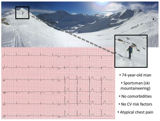 A 74-year-old man, who is a sportsman (ski mountaineering) (Figure 1), was symptomatic for atypical chest pain, and underwent a maximal (respiratory exchange ratio at peak (RER) 1.1) ramp protocol CPET, showing metabolic and ECG signs of MI (Figure 2A,B). Baseline CPET data are presented in Table 1. In brief, peak VO2 was 27.7 mL/min/Kg (corresponding to 112% of the predicted VO2), peak O2-pulse was 11.4 mL/bpm (corresponding to 105% of the predicted peak O2-pulse), and maximal HR was 154 bpm (105% of the predicted maximal HR).