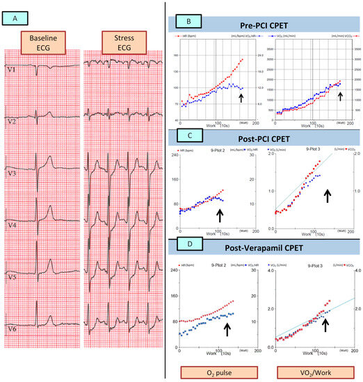 Serial CPETs. The figure shows the exercise-induced ECG changes (A) and the metabolic changes in both the baseline CPET (B) and in the post-PCI CPET (C) with a clear flattening/downsloping of the O2-pulse and VO2/Work (arrows). Panel (D) shows the normalization of the metabolic behavior after the introduction of Verapamil in the medical therapyAbbreviations: CPET = Cardiopulmonary Exercise Testing; PCI = Percutaneous Coronary Intervention; VO2 = Oxygen Intake.