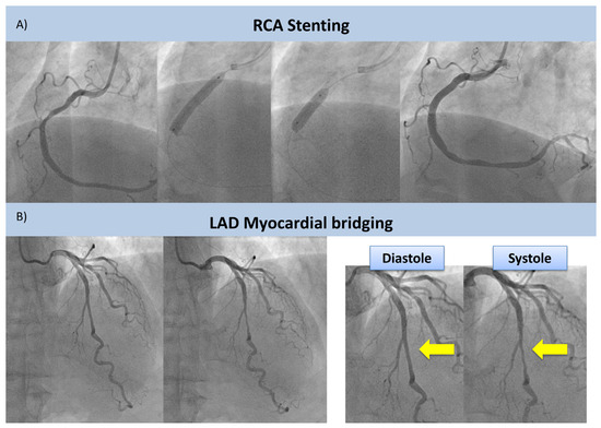CA and PCI. CA shows stenosis of the RCA undergoing successful PCI without complications (upper panel, (A)) and the presence of a MB of the LAD (lower panel, (B)). MB is showed by yellow arrows. Abbreviations: CA = Coronary Angiography; RCA = Right Coronary Artery; PCI = Percutaneous Coronary Intervention; MB = Myocardial Bridging; LAD = Left Descending Artery.