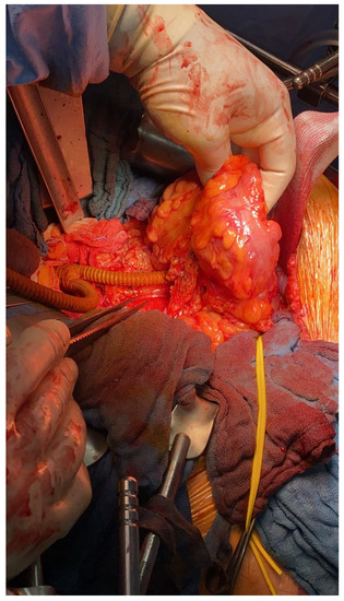 Several techniques have been described for the treatment of aortic graft infections, ranging from isolated anti-infection therapy to graft explantation with extensive debridement of all infected tissue followed by revascularization using extra-anatomic bypass or in situ reconstruction [9,11,12,13,14,15,16]. All these approaches remain challenging because of prolonged operating times, sufficient length of the autologous graft, limited availability of certain prostheses, patency (especially through extra-anatomical bypass), and the risk of re-infection [9,22]. In a study of 122 VGI patients with various surgical approaches—semiconservative (21%) with infection drainage and preservation of the vascular prosthesis; resection (38%) with extra-anatomic bypass; and in situ reconstruction (32%)—the semi-conservative approach was associated with the poorest long-term outcomes [23].