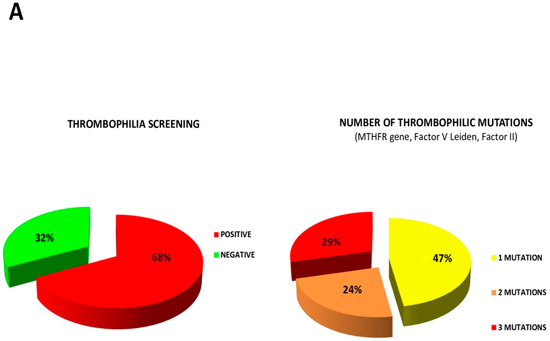 Thrombophilia screening was positive in 68% of the patients (47% have one mutation, 24% have two mutations and 29% have three mutations) (Figure 3A).