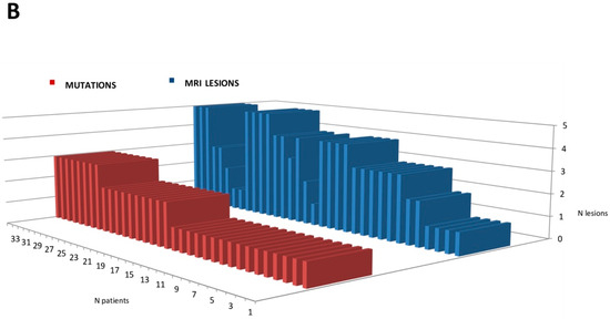 A comparison between the number of genetic mutations (one, two, three) and the increasing number of MRI lesions is shown in Figure 3B. The indications for transcatheter intervention and procedural characteristics are summarized in Table 2 and Table 3.