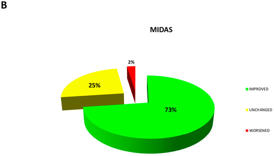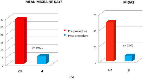 (A) Left panel: pre- and post-procedure mean migraine days; right panel: pre- and post-procedure Migraine Disability Assessment Score (MIDAS); (B) percentage changes in MIDAS in migraine patients.