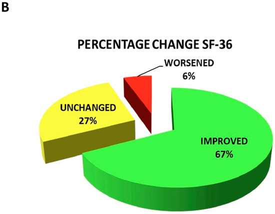 In terms of QOL SF-36, 67% of the patients improved, while 27% remained unchanged and only 6% worsened (Figure 6A,B, Table 4).