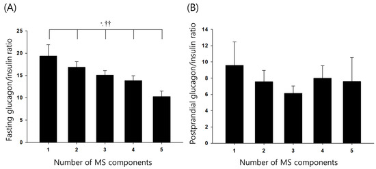 Differences in fasting glucagon/insulin ratio (A) and postprandial glucagon/insulin ratio (B) according to the number of components of metabolic syndrome. Values are expressed as mean ± SE. MS, metabolic syndrome; ANOVA, analysis of variance; p for trend, p value by the test for linear trend. * p ANOVA < 0.05; †† p for trend < 0.01.