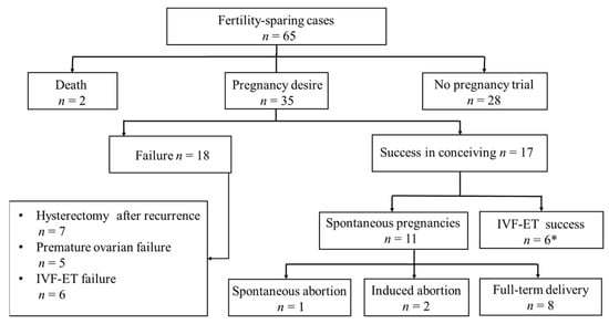 With regard to pregnancy outcomes, 48.6% (17/35) of young women became pregnant after attempting to conceive following conservative treatment. Interestingly, these women who became pregnant spontaneously were either disease-free or completed childbearing before the first recurrence. The mean time between initial surgery and parturition was comparable to the disease-free interval. Therefore, the optimal timing for pregnancy might be one year after first surgery, which allows sufficient recovery post-operatively and avoid the peak time of recurrence. Considering repeated FSSs is necessary if patients have not finished childbearing before the first relapse. Besides, five women had successfully given birth to healthy babies through ART and they survived with no evidence of disease. However, whether ovarian stimulation would increase the risk of disease progression remains unclear [27,28]. Further evidence is needed for ART in advanced-stage SBOTs. Hence, an oncofertility consultation prior to fertility-sparing surgery is essential in order to assess reproductive status and prepare for postoperative pregnancies.