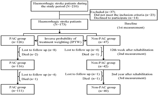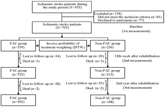 The inclusion criteria for this study were based on specific ICD-9-CM (430 and 431 for hemorrhagic stroke; 433.x, 434.x, and 436.x for ischemic stroke) and ICD-10 (I60–I62 for hemorrhagic stroke; I63 for ischemic stroke) codes for stroke types. Patients were considered eligible if they were admitted to a PAC ward at two medical centers or a non-PAC ward at three regional hospitals and one district hospital in south Taiwan between August 2015 and August 2021. Furthermore, patients needed to meet certain enrollment criteria, including being hospitalized for their first-ever stroke, having undergone computed tomography or magnetic resonance imaging examination within 30 days, and having a Modified Rankin Scale (MRS) score of 2 to 4. The MRS scale ranges from 0 to 5, where scores of 0, 1, 2, 3, 4, and 5 indicate no symptoms, no significant disability, slight disability, moderate disability, moderately severe disability, and severe disability, respectively [15]. Patients were excluded if PAC beds were unavailable at the participating hospitals or if they had been transferred to PAC wards at other hospitals. Initially, a total of 953 patients with ischemic stroke and 210 with hemorrhagic stroke were available during the study period. After excluding those who did not meet the inclusion criteria and those who declined to participate, a total of 795 ischemic stroke patients and 173 hemorrhagic stroke patients were initially recruited into the study (Figure 1 and Figure 2). The study protocol received approval from the institutional review board of Kaohsiung Medical University Hospital (KMUH-IRB-20140308), and informed consent was obtained from each participant before their enrollment in the study.