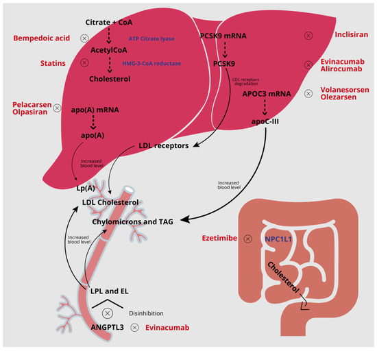 Angiopoietin-like protein 3 is a polypeptide that plays an important role in lipid metabolism. It is mainly secreted in the liver. ANGPTL3 acts as an inhibitor of lipoprotein lipase (LPL) and endothelial lipase (EL), thereby increasing circulating levels of triglycerides and LDL-cholesterol [90]. Inhibition of ANGPTL3 leads to disinhibition of LPL and EL and thus to a decrease in triglycerides and LDL-cholesterol [91]. Inhibition of ANGPTL3 by monoclonal antibodies and antisense oligonucleotides has been the focus of recent clinical trials. Evinacumab, a monoclonal antibody against ANGPTL3, has been studied in patients with HoFH. The reduction in LDL-cholesterol induced by evinacumab is statistically significant, with reductions of −49 and −59% reported [92,93]. In patients with mixed dyslipidaemia, evinacumab has a rapid effect on lowering triglycerides, which decreased by 77 and 83% on days 2 and 3, respectively [94]. Commonly reported adverse effects included flu-like symptoms and mild increases in aminotransferases and creatine kinase [92,94]. No serious adverse effects were reported in patients treated with evinacumab. Vupanorsen is an antisense oligonucleotide that decreases ANGPTL3 expression. It has shown good results with significant reductions in non-HDL-C, apoB, total cholesterol and especially TGs [95,96,97]. Vupanorsen has also increased insulin sensitivity and lowered fasting blood glucose in diabetics [97]. However, although vupanorsen produced a significant improvement in the lipid profile in treated patients, it was withdrawn from the clinical development programme [98]. The clinical trial TRANSLATE-TIMI was discontinued due to hepatic steatosis and >3-fold increases in alanine and aspartate aminotransferases attributed to treatment with vupanorsen [95]. Evinacumab is currently approved by the EMA and FDA for the treatment of HoFH. It is administered as an intravenous infusion at the recommended dose of 15 mg/kg. Evinacumab and new ANGPTL3 inhibitors that may be produced in the future could be important drugs for patients with residual cardiovascular risk associated with high levels of TGs.