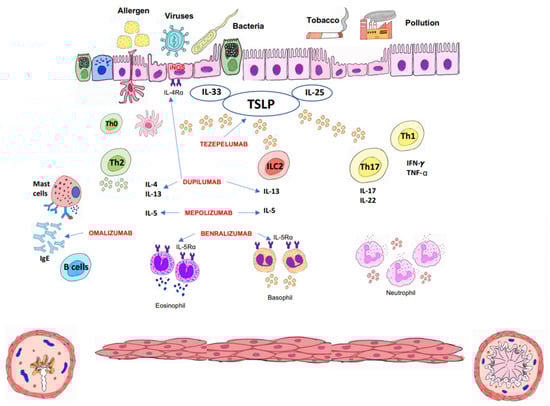 Immunopathology of asthma, biological drugs, and their therapeutic targets. TSLP: thymic stromal lymphopoietin.