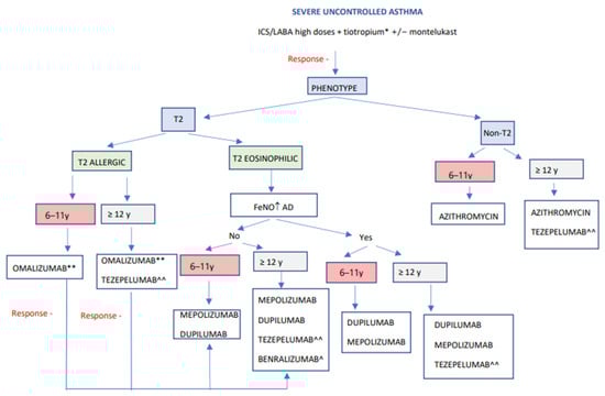 Taking into consideration all of the above, we present an algorithm (Figure 3) that allows for the selection of an appropriate biologic for a patient based on age and different biomarkers. This algorithm is centered on the phenotypic characterization of allergic asthma indicators, peripheral blood eosinophil counts, and FeNO levels [113]. Likewise, some authors suggest considering pulmonary function for choosing the most appropriate drug [22]. In this sense, when selecting a biological treatment for a compromised lung function child, a drug with improving lung function potential, for instance dupilumab, should be used. Other treatments with low effect on lung function, such as omalizumab and mepolizumab, should instead be avoided [114,115]. Another factor to consider is the presence of comorbidities that could also benefit from specific biological therapies. In the case of moderate-to-severe atopic dermatitis or eosinophilic esophagitis, along with T2 asthma, dupilumab could improve both diseases. In contrast, a patient with chronic spontaneous urticaria and allergic asthma would benefit significantly from receiving treatment with omalizumab. In addition, as previously mentioned, a new biologic therapy, tezepelumab, has recently been approved by the EMA, being found to be more effective in eosinophilic asthma. This treatment has also demonstrated its efficacy in patients with low levels of T2 inflammation biomarkers, offering great possibilities in this group of patients with less availability of biological drugs [116,117]. On the other hand, also in non-T2 patients, regular long-term use of azithromycin has been shown to reduce asthmatic exacerbations, independently of the inflammatory endotype. Still, it could be even more effective in people with airway colonization by Haemophilus influenza [118,119].