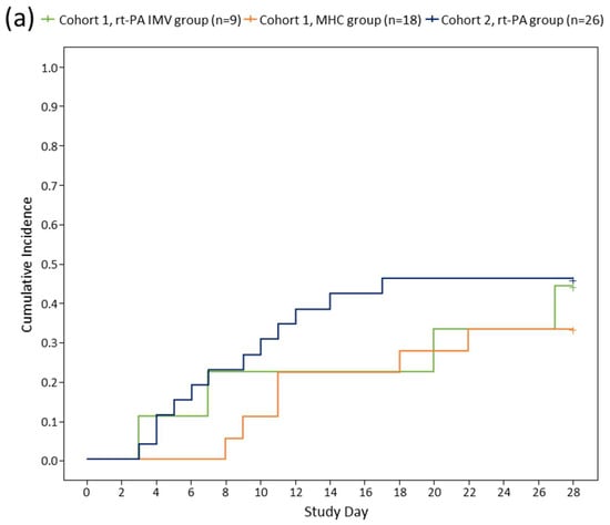 Time to recovery among Cohorts 1 and 2 (a); IMV/NIRS subgroups in Cohort 2 (b). The graph shows time to recovery, the cumulative incidence of recovery among Cohort 1 and Cohort 2 (a) and IMV and NIRS subgroups in Cohort 2 (b) (post hoc exploratory results). Time to recovery was defined as the time to achieve a 7-point WHO ordinal score of 1 or 2, or discharge. A breakdown of the WHO ordinal score is provided in Table S4. Data for patients who did not recover and data for patients who died were censored on Day 28. IMV, invasive mechanical ventilation; NIRS, non-invasive respiratory support; rt-PA, recombinant tissue plasminogen activator; MHC, matched historical control.