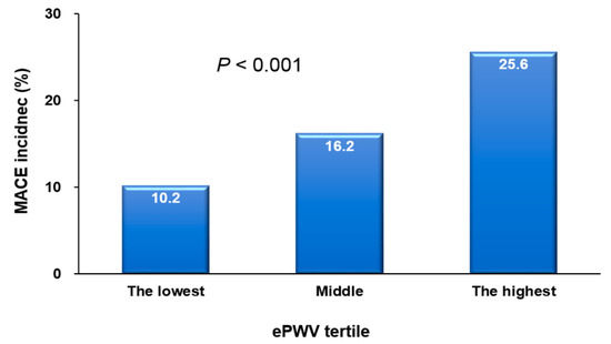 The ePWV was notably higher in the patients who experienced a MACE compared to those who did not (11.82 ± 2.13 vs. 10.65 ± 2.13 m/s; p < 0.001) (Figure 1). There was a proportional increase in the incidence of MACEs from the lowest to the highest tertile of the ePWV (p < 0.001) (Figure 2).