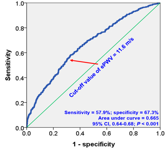 The ROC curve analysis identified an ePWV cut-off value of 11.6 m/s for predicting MACEs, yielding a sensitivity of 57.6% and a specificity of 67.3% (area under curve, 0.665; 95% confidence interval, 0.64–0.68; p < 0.001) (Figure 3).