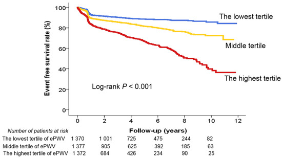 Event-free survival rate according to ePWV tertile. ePWV, estimated pulse wave velocity.