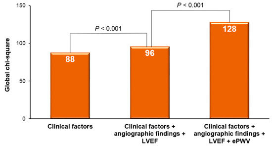 The predictive power for MACEs increased significantly when the angiographic findings and left ventricular ejection fraction were added to the other clinical factors, as evidenced by a rise in the global chi-square from 88 to 96 (p < 0.001). Further inclusion of ePWV information to the clinical factors, angiographic findings, and left ventricular ejection fraction resulted in an even greater enhancement of MACE prediction, elevating the global chi-square from 96 to 128 (p < 0.001). These results are illustrated in Figure 5.