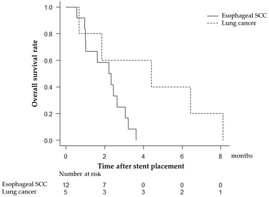 Overall survival after SEMS placement was determined using the Kaplan–Meier method. Kaplan–Meier curves are presented separately because the prognosis of each cancer is different. SCC: squamous cell carcinoma.