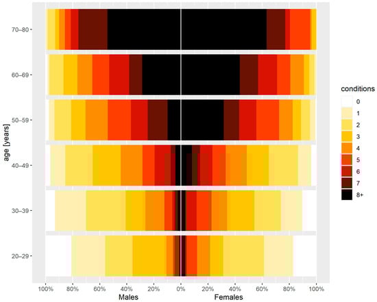 Among the overall individuals aged 20–80 years, 1422 (88.2%) of the total 1612; 787 (88.9%) of 885 women and 635 (87.3%) of 727 of men had been diagnosed with at least two conditions. The number of diagnosed conditions per individual increased with age, with differing pathways in women and men. Women showed a higher number of conditions than men in the same age groups (Table 3 and Table 4; Figure 1).