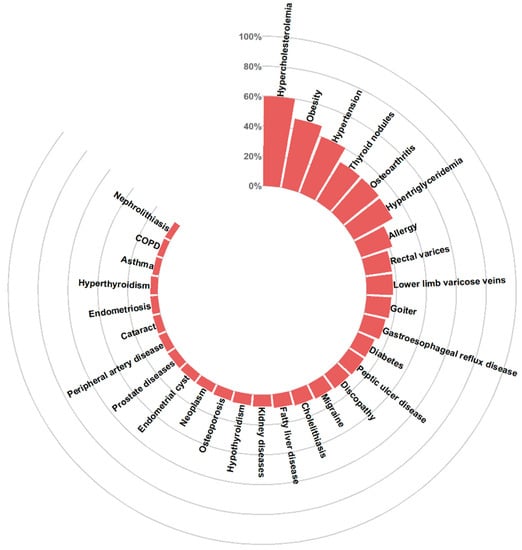 The most common disease entities in the general population were hypercholesterolemia (59.9%), obesity (46.9%), hypertension (40.3%) and focal thyroid lesions (30.6%). Detailed data are included in the Supplementary Material (Table S1) and are shown in Figure 2.