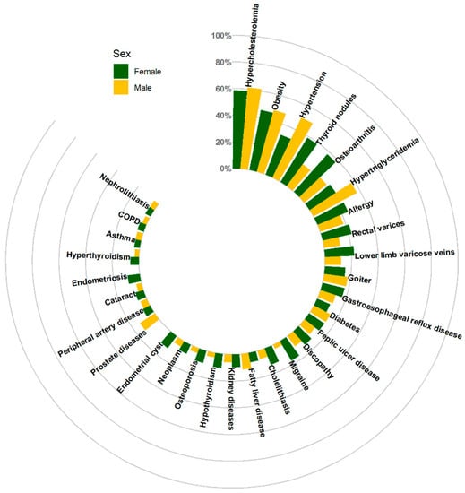 The most common diseases in the male population were hypercholesterolemia (61.5%), hypertension (50.2%) obesity (48.1%) and hypertriglyceridemia (37.3%), whereas the most common conditions in the female population were hypercholesterolemia (58.6%), obesity (45.9%), focal thyroid lesions (38.9%) and osteoarthritis (37.9%). The prevalence of multiple conditions differed statistically significantly by sex. Detailed data are included in the Supplementary Material (Table S1) and are shown in Figure 3.