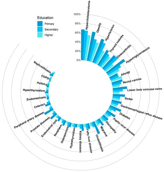The most common diseases in the primary education subgroup were hypercholesterolemia (66.7%), obesity (64.3%), hypertension (54.8%) and hypertriglyceridemia (47.6%). The most common conditions in the secondary education subgroup were hypercholesterolemia (64.5%), obesity (49.4%), hypertension (48.3%) and osteoarthritis (39.6%), whereas the most common conditions in the higher education subgroup were hypercholesterolemia (55.5%), obesity (43.8%), hypertension (32.3%) and focal thyroid lesions (28.8%). The prevalence of a few entities differed statistically significantly in terms of educational level. Detailed data are included in the Supplementary Material (Table S1) and are shown in Figure 4.