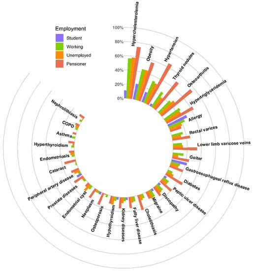 The most common diseases in the subgroup of students were allergy (29.6%), obesity (22.2%), gastroesophageal reflux disease (22.2%) and hypertension (14.8%). The most common conditions in the employed subgroup were hypercholesterolemia (56.6%), obesity (44.1%), hypertension (33.2%) and hypertriglyceridemia (26.4%), whereas the most common conditions in the unemployed subgroup were hypercholesterolemia (58.1%), obesity (44.2%), hypertension (31.4%) and osteoarthritis (28.8%). The most common diseases in the subgroup of pensioners were hypercholesterolemia (74.0%), hypertension (65.4%), obesity (57.0%) and osteoarthritis (55.5%). Detailed data are included in the Supplementary Material (Table S1) and are shown in Figure 5.