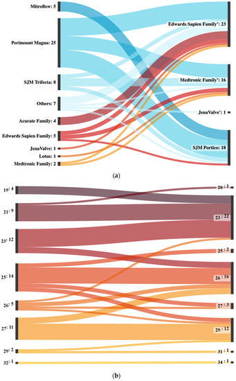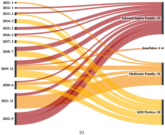 (a) Sankey plot of all interventions with valves used in the index procedures on the left and valves in the valve-in-valve-intervention on the right. Lines of index procedures in which surgical aortic valve replacements were performed are colored blue, while lines of index procedures in which transcatheter aortic valve implantations were performed are colored red. Acurate family includes Acurate neo and Acurate neo 2. Edwards Sapien family valves include Sapien XT, Sapien 3 and Sapien 3 Ultra. Medtronic family includes CoreValve, Evolut R, Evolut pro and Evolut pro+. The “Others” category includes Abbott Epic, Freedom Solo, Sulzer Vascutec and Toronto SPV. (b) Sankey plot of all interventions sorted by initial valve size on the left and valve-in-valve sizes on the right. All sizes are given in millimeters. (c) Sankey plot of all interventions sorted by year and corresponding valve type. Edwards Sapien family valves include Sapien XT, Sapien 3 and Sapient 3 Ultra. Medtronic family includes CoreValve, Evolut R and Evolut pro.