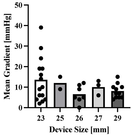Correlation between device size and mean gradient post-interventionally. Data points represent all available mean gradient measurements post-interventionally. Bars represent the mean of all data points.