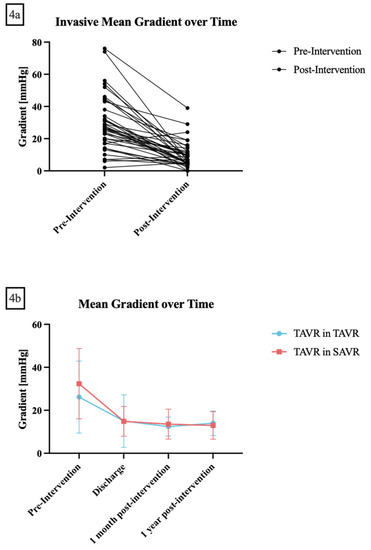 (a) Invasive mean gradient before and after the intervention. (b) Trans-thoracal echocardiographic gradients before, at discharge, one month and one-year post-intervention. Transcatheter aortic valve replacement (TAVR) in TAVR is shown in red while TAVR in surgical aortic valve replacement is shown in blue. Data are presented as mean ± standard deviation.