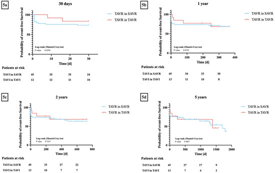 Kaplan–Meier analyses regarding event-free survival were carried out between patients from the TiSAVR and TiTAVR groups at 30 days, one year, two years, and five years after the procedure. At 30 days, the incidence of endpoints defined by VARC-3 was 24% in the TiSAVR group and 17% in the TiTAVR group (p = 0.48). At one year, the incidence in the TiSAVR group was 31% and 33% in the TiTAVR group (p = 0.98). At two years, the incidence in the TiSAVR group was 36% and 33% in the TiTAVR group (p = 0.75). Finally, at five years, the incidence in the TiSAVR group was 42% and 42% in the TiTAVR group (p = 0.81). The log-rank test showed no significant differences between the two groups in terms of overall event-free survival rates and incidence of clinical endpoints defined by VARC-3 at any follow-up time point (p = 0.44, p = 0.88, p = 0.73, p = 0.98) (Figure 5).