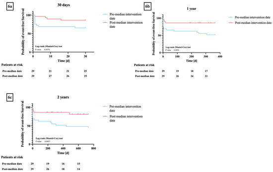 (a–c) Kaplan–Meier curves for event-free survival* between groups pre and post the median valve-in-valve-procedure date: (a) 30 days, (b) one year, (c) two years. * Event-free survival as defined by Valve Academic Research Consortium 3. Log-rank testing showed no significant differences in event-free survival between the two groups at 30 days (p = 0.06) but was able to show significant differences in 1- and 2-year event-free survival (p < 0.01).