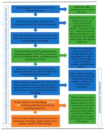 - García del Águila, J.; López-Messab, F.; Rosell-Ortiza, R.; de Elías Hernández, M.; Martínez del Valled, L.; Sánchez-Santos, J.; López-Hercef, M.; Cerdà-Vilag, C.L.; Roza-Alonsody, M.; Bernardez-Otero, M. Recomendaciones para el soporte telefónico a la reanimación por testigos de los centros de coordinación de urgencias y emergencias. Med. Intensiv. 2015, 39, 198–302. [Google Scholar] [CrossRef] [PubMed]