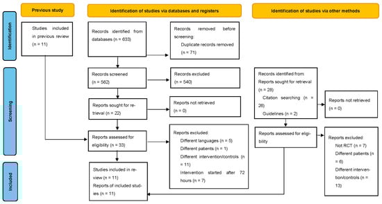 The PRISMA flow diagram of the study selection process is shown in Figure 1. The updated search retrieved 631 studies, of which 24 were included in the full-text screening process. Of those assessed in the previous SRMA [8], seven studies described interventions within 72 h of ICU admission [16,17,18,19,20,21,22]. Four studies were newly included in the current SRMA [23,24,25,26]. In total, 11 studies were included in the meta-analysis after excluding those written in languages other than English and Japanese, studies that were not RCTs, those that did not incorporate critically ill patients, those that started the intervention after 72 h, and studies with interventions other than early rehabilitation (Table S3). The characteristics of the 11 studies [16,17,18,19,20,21,22,23,24,25,26] are shown in Table 1. The included RCTs were published between 2009 and 2023. The patient cohort sizes across the studies displayed variation, ranging from 10 patients in both the intervention and comparison groups, to larger trials involving 150 patients in each group. The sizes of the RCTs exhibited diversity. Among the studies, only one—conducted by Kayambu—focused exclusively on septic patients. Several other studies encompassed the entirety of ICU patients, while the majority concentrated on patients requiring mechanical ventilation. Notably, six studies [17,20,21,22,23,24] evaluated primary outcomes, with all interventions being administered on a daily basis throughout these studies.