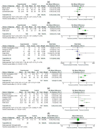 Forest plot of each primary and secondary outcome [16,17,18,20,21,22,23,24]. (a) Muscle strength. (b) Cognitive function. (c) Adverse effects. (d) Activities of daily living. (e) Quality of life. (f) Mental health. (g) Mortality. SD, standard deviation; CI, confidence interval; df, degrees of freedom. Blue blocks indicate RR and green blocks indicate MD or SMD.
