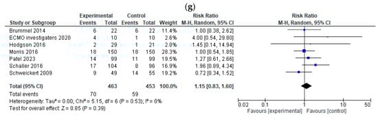 Mortality. Seven RCTs [16,17,20,21,23,24] evaluated the effects of early mobilization on short-term mortality. We observed that early mobilization resulted in little to no difference in short-term mortality (N = 916; RR, 1.15; 95% CI, 0.83–1.60; CoE, low; Figure 2g, Table 2). The risk of bias was determined not to be serious (Figure S1g). However, imprecision was rated as very serious due to an insufficient sample size and a wide 95% CI. Therefore, the CoE was reduced to low.