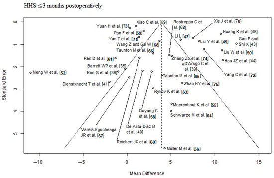 Funnel plot of the HHS ≤ 3 months postoperatively. Many RCTs [43,44,45,49,50,70,72] lie outside of the funnel plot triangle, especially in the upper right area, which detects a high risk of publication bias (Egger’s p-value = 0.03). HHS: Harris hip score [35,36,39,40,41,43,44,45,47,49,50,52,55,56,58,59,60,61,62,63,64,65,66,67,68,69,70,71,72,73,74,75].