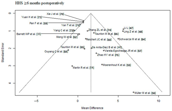 Funnel plot of the HHS ≥ 6 months postoperatively. Most of the RCTs lie inside of the funnel plot triangle, which detects a low risk of publication bias. HHS: Harris hip score [35,40,47,48,51,52,55,56,58,59,60,64,65,66,67,70,71,72,73,74,75].