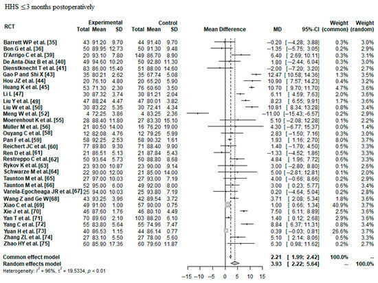Data on 2690 THAs were pooled from 32 RCTs (I2 = 96%, p < 0.01, Figure 5). The HHS ≤ 3 months postoperatively of minimally invasive THA was 3.93 points higher than the HHS ≤ 3 months postoperatively of conventional approach THA (MD = 3.93, 95% CI 2.22 to 5.64).