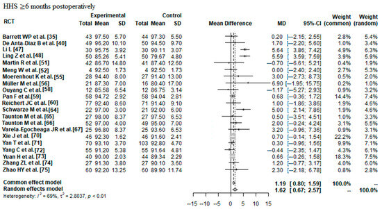 Data on 1698 THAs were pooled from 21 RCTs (I2 = 69%, p < 0.01, Figure 6). The HHS ≥ 6 months postoperatively of minimally invasive THA was 1.62 points higher than the HHS ≥ 6 months postoperatively of conventional approach THA (MD = 1.62, 95% CI 0.67 to 2.57).