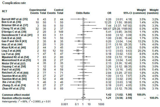 Funnel plot of the complication rate. Most of the RCTs lie inside of the funnel plot triangle, which detects a low risk of publication bias [35,36,37,38,39,41,42,43,44,46,48,49,54,55,57,58,59,60,65,66,70,74,75].